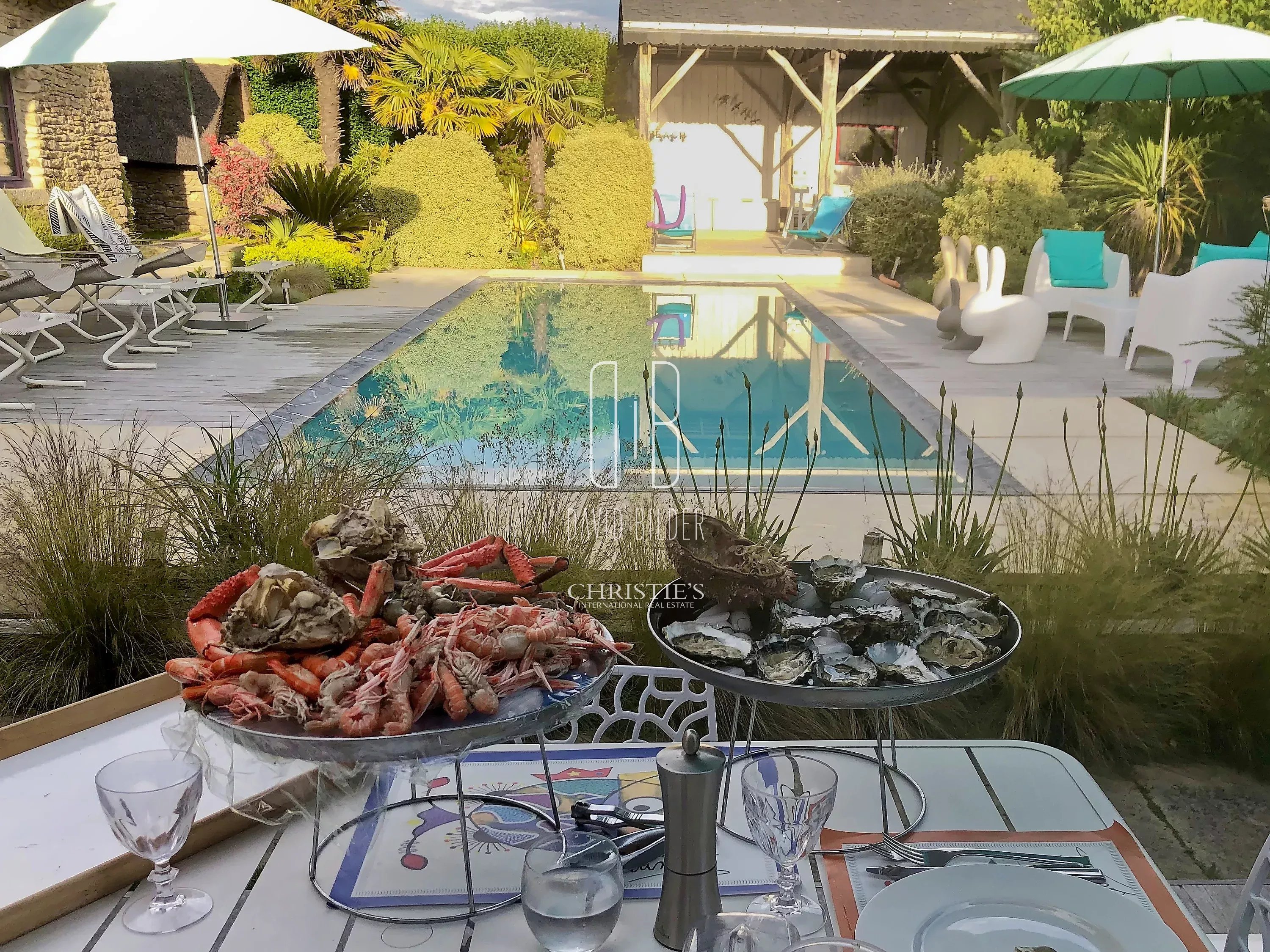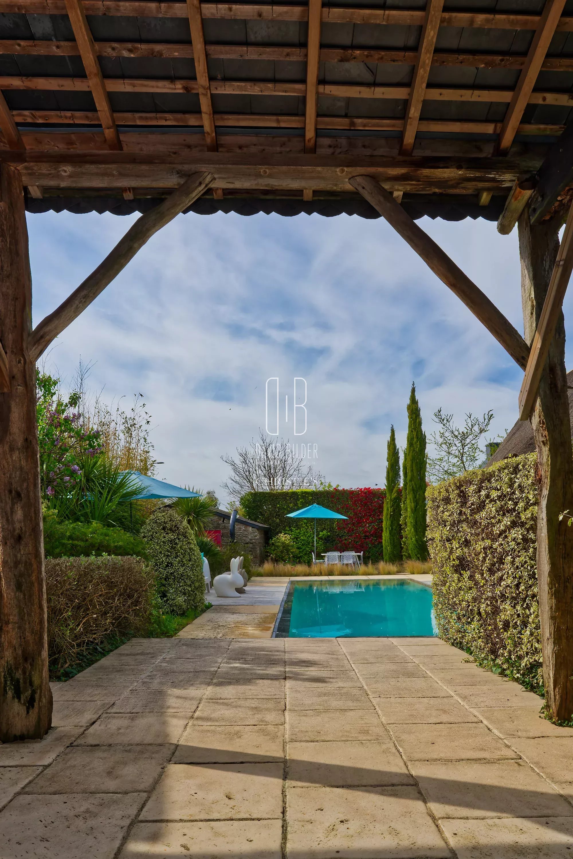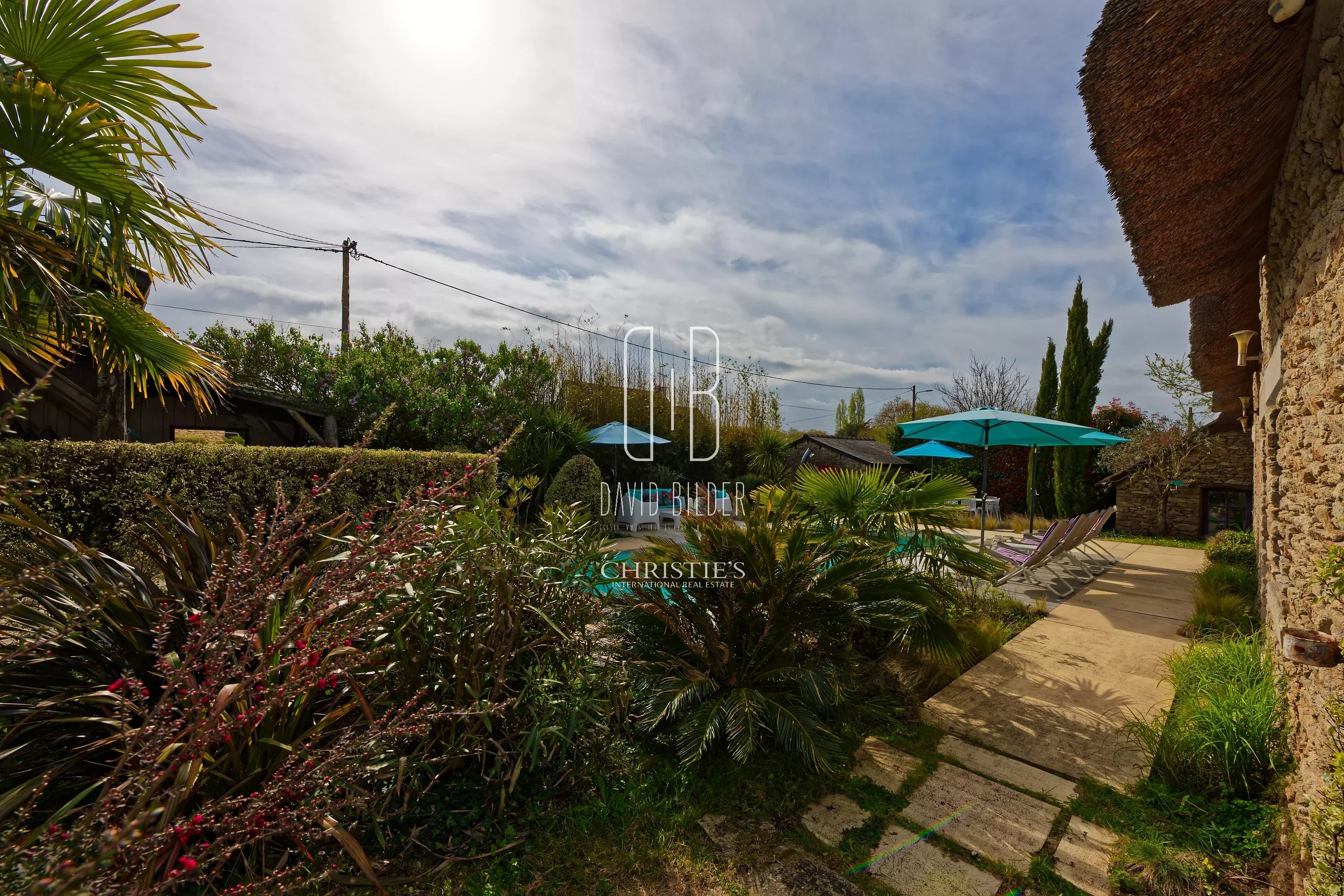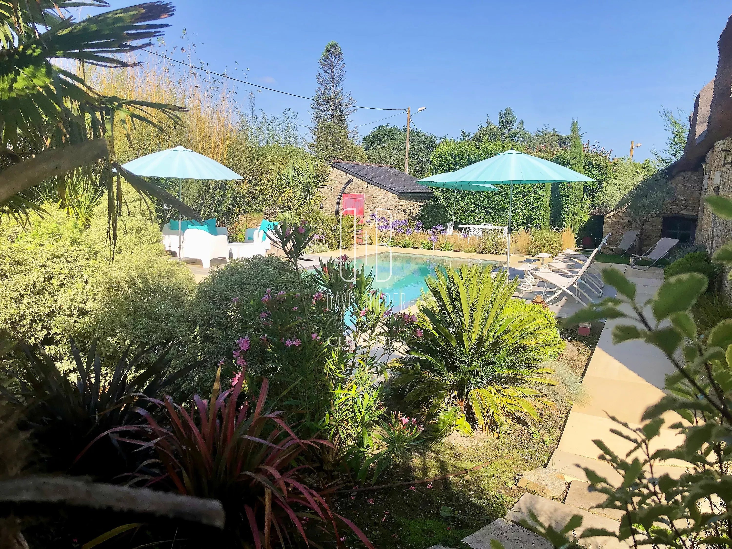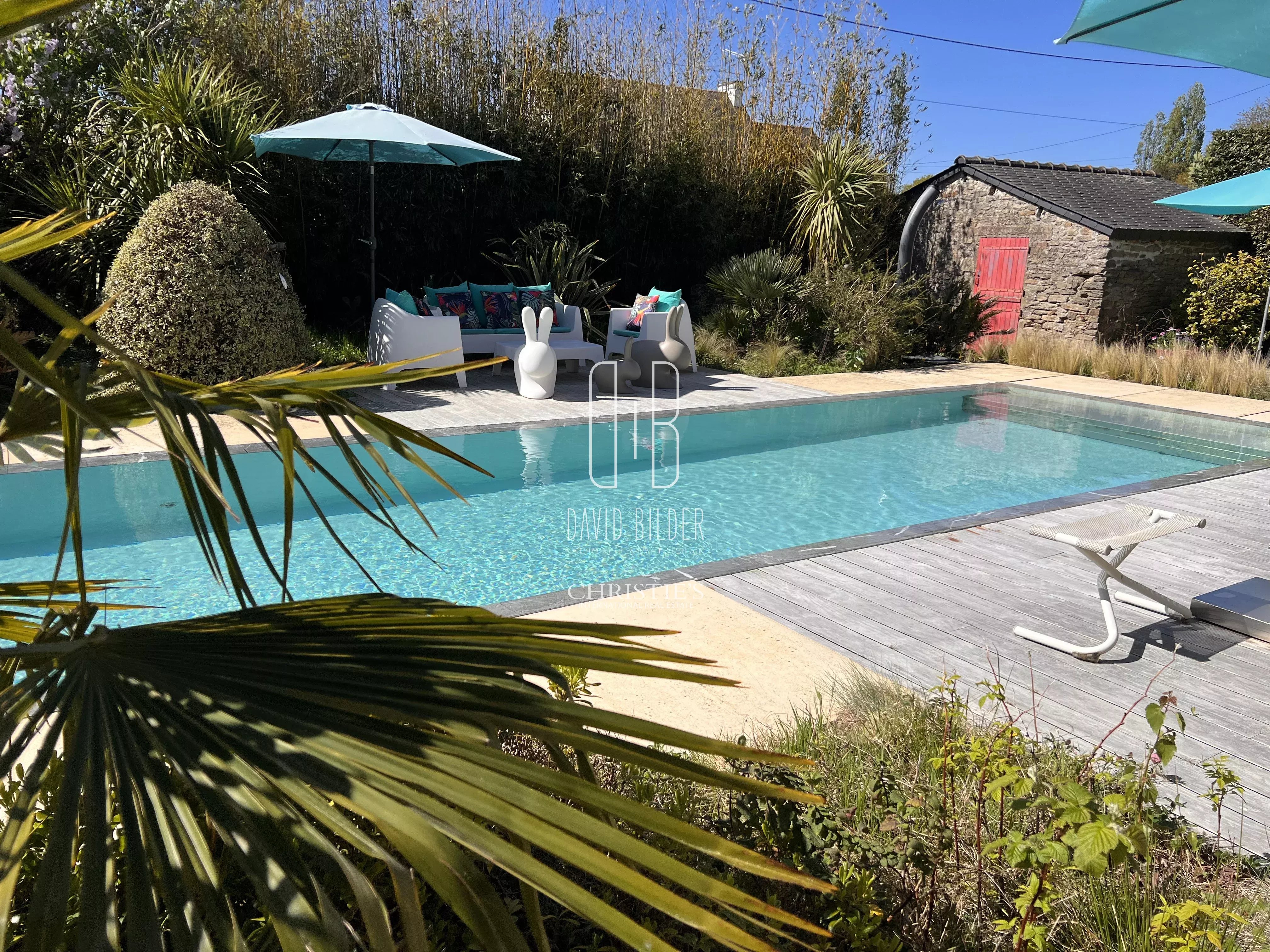 Outside, the 1000 m² landscaped garden reveals its most beautiful surprise: a 11 m x 4 m overflow pool, heated, of rare elegance, a large shelter ideal for summer evenings, two stone outbuildings, and a flower garden that reinvents itself over the seasons.