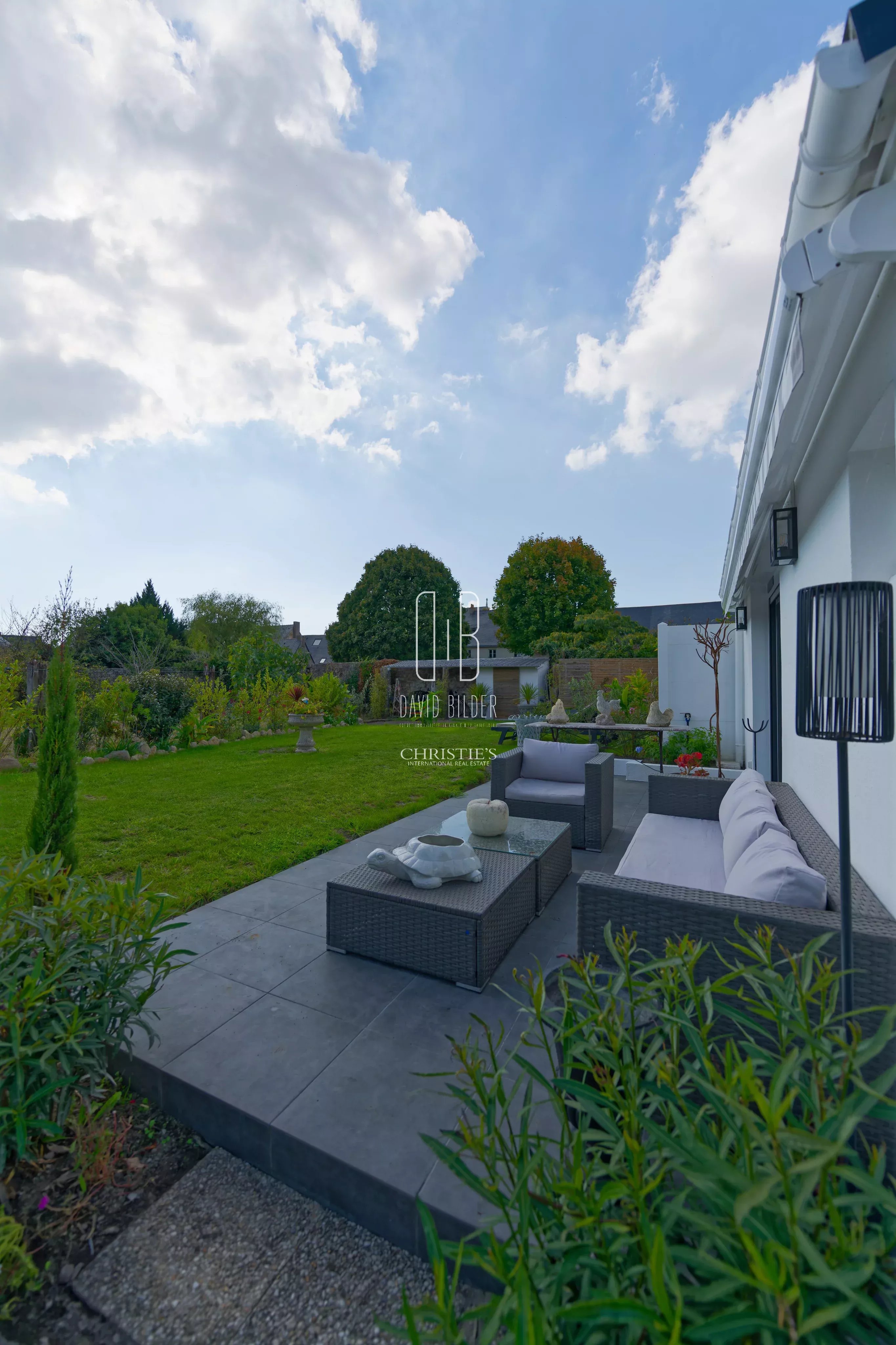 Une belle terrasse plein Sud, jardin arboré avec garage et stockage.