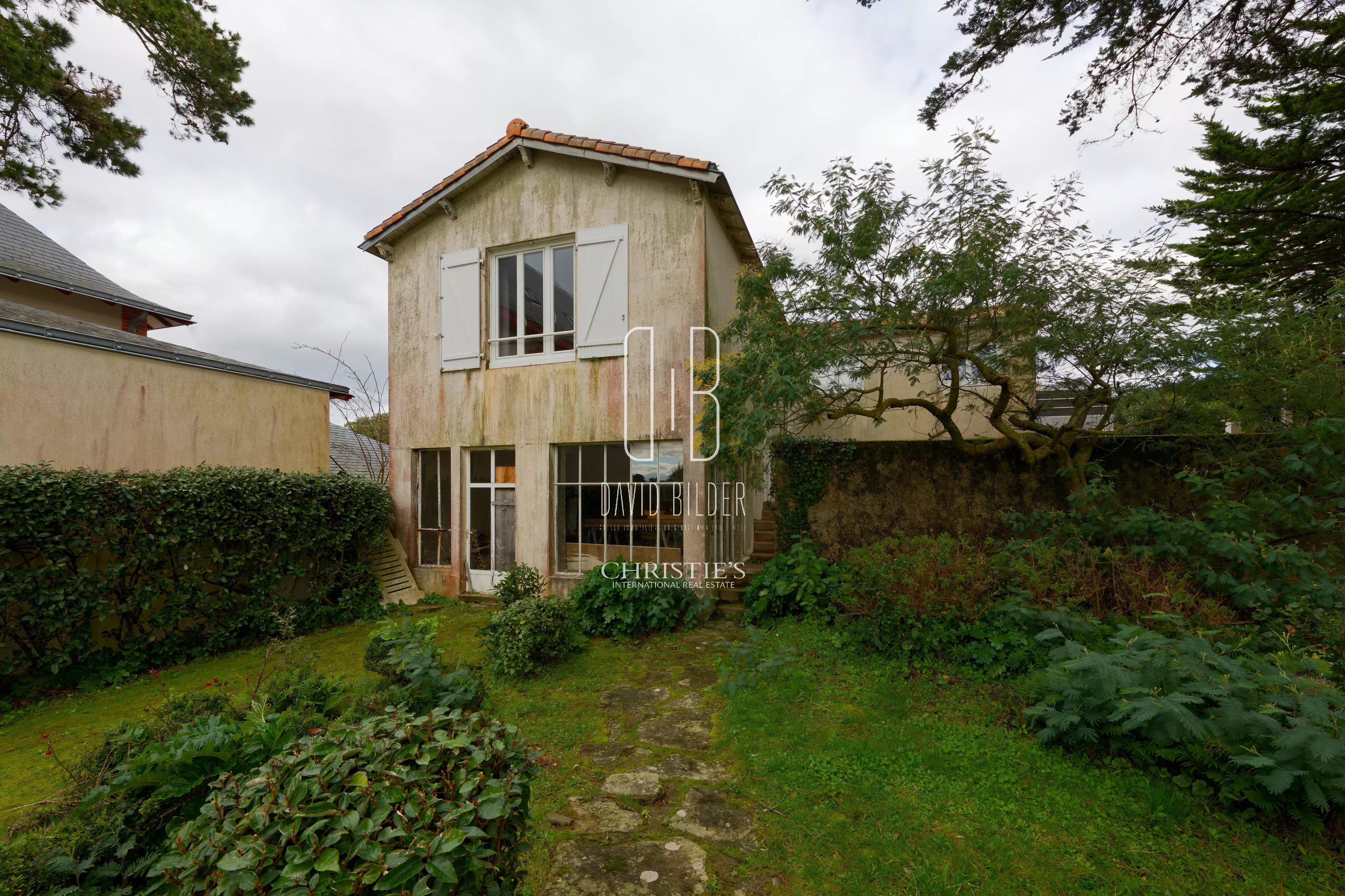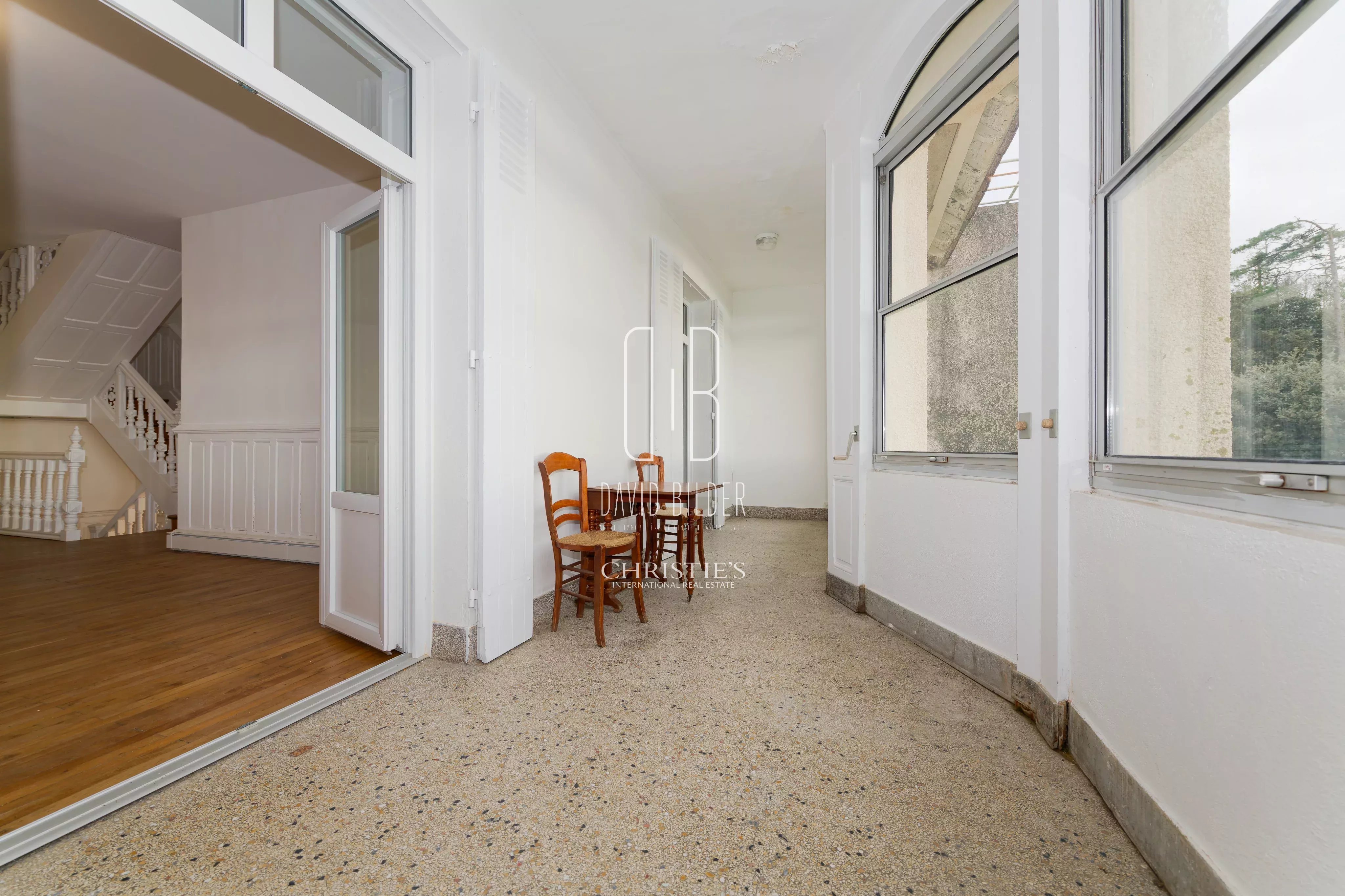 La propriété comprend également une maison d'amis avec son appartement indépendant de 67m² à l'étage, et en rez-de-jardin un ancien jardin d'hiver avec verrière vue mer, buanderie et garage — un second projet dans le projet.