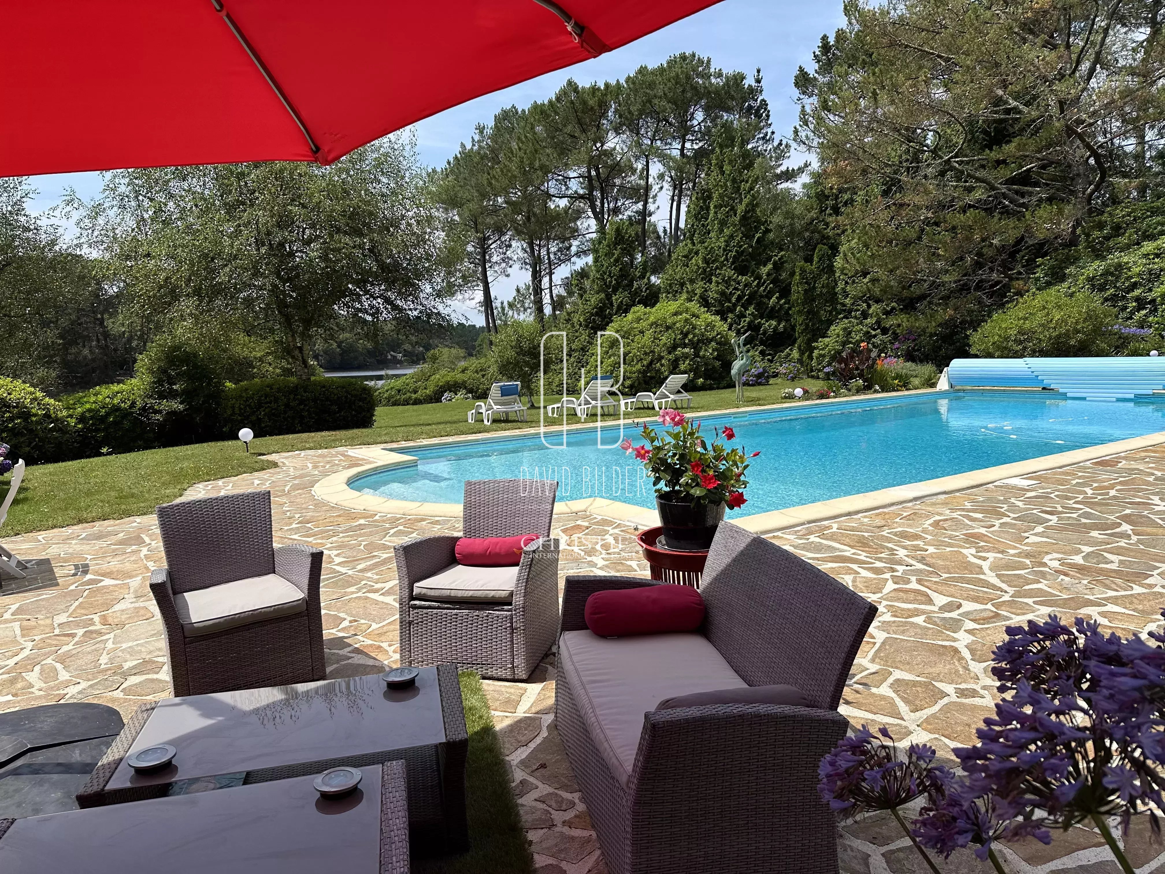 Les pièces de vie bénéficient d'une vue dégagée sur le parc, la rivière et la piscine élégamment intégrée.